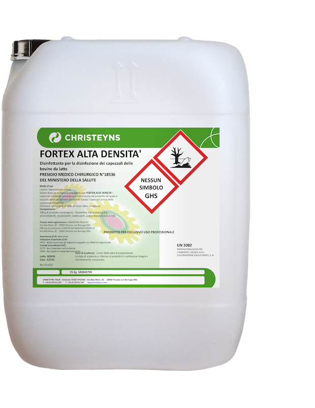 Subito dopo la mungitura cospargere con FORTEX ALTA DENSITA’ i capezzoli mediante spruzzatura o immersione nel prodotto tal quale e lasciarlo agire per almeno 60 minuti. Lavare i capezzoli prima della successiva mungitura.