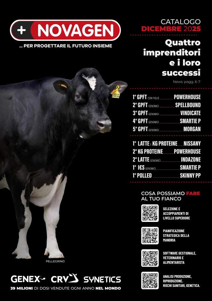 Novagen è distruibutore in Italia dei noti marchi Genex e CRV. L’americana GeneX è una azienda formata dalla dedizione di soci allevatori e volta alla costante ricerca di riproduttori che soddisfino elevate caratteristiche genetiche. Lo storico marchio CRV (Cooperativa degli Allevatori dei Paesi Bassi e delle Fiandre) è leader europeo nella selezione e fondatore di un programma di selezione sviluppato in Usa, dal quale risultano tori riproduttori improntati sul Net Merit e sul Fitness.