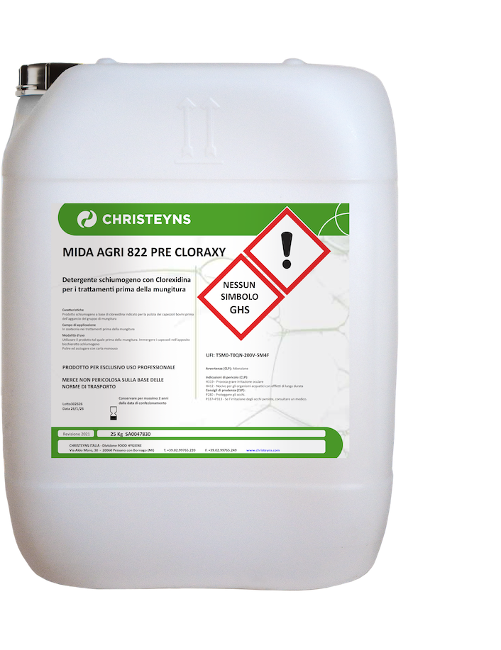 Prodotto schiumogeno a base di clorexidina indicato per la pulizia dei capezzoli bovini prima dell’aggancio del gruppo di mungitura.