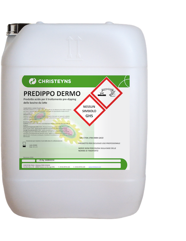 PREDIPPO DERMO è un prodotto acido, pronto all’uso, da utilizzare prima della mungitura per pulire i capezzoli delle bovine da latte. Contiene una associazione di acido citrico e acqua ossigenata.